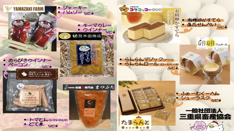 | 三重 | 養鶏は、ロールケーキ、プリン、カステラ、シューラスク等の菓子類 養豚は、ジャキー、フランクフルト、ベーコン、ピザ等の加工品 |