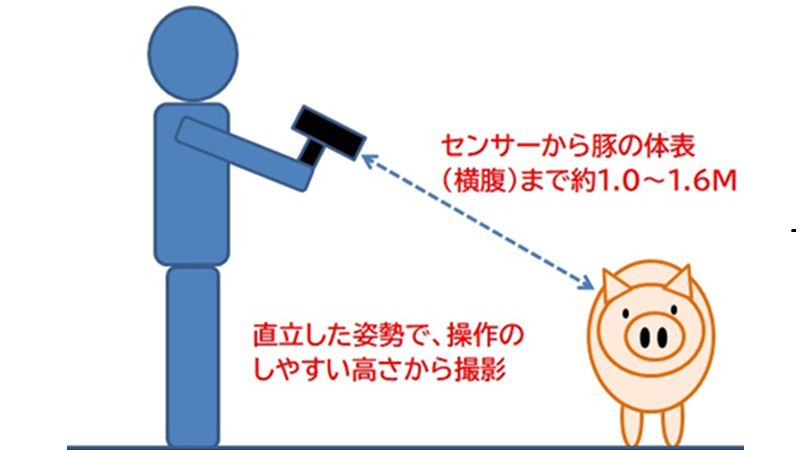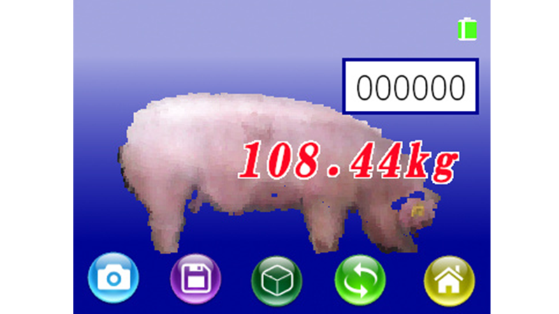 豚の側面からHapimo P-Scaleを向けて撮影ボタンを押すだけで、約3秒後に豚の体重が表示されるます。小型で軽量(850g)、GUNタイプなので片手で操作できます。体重の誤差は平均3%以下(豚用体重計で測定した体重と比較)、豚が動いていても測定可能です。出荷判定用として90~120kgくらいの豚が最も精度よく測定できます。