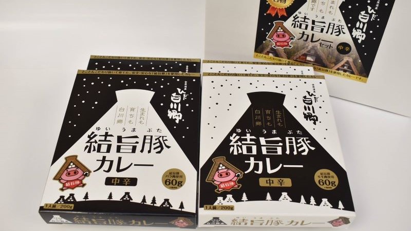 | 結旨豚カリー | 世界遺産白川郷に程近い農場で育てられた結旨豚を使った美味しいカリーが出来ました。 脂の甘さが溶け込んだバラ肉入りと赤身の旨さとピリッとした辛さが特徴のモモ肉入りがあります。 |