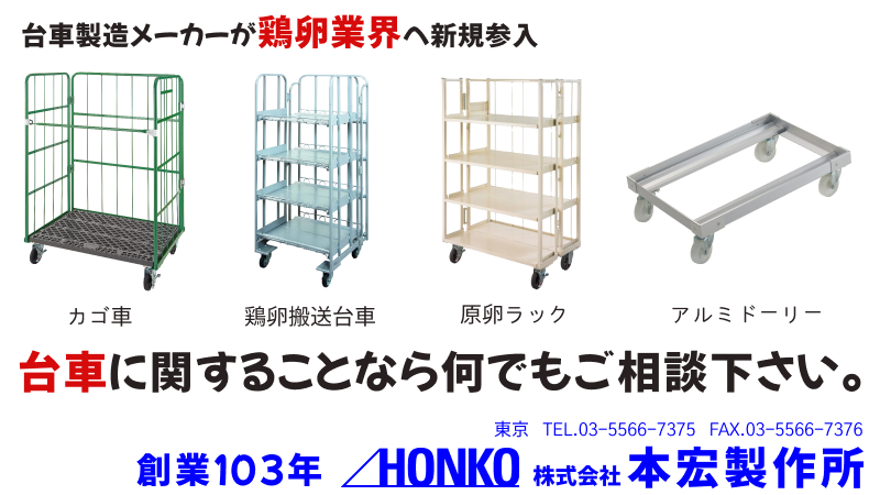 鶏卵を安全に保管、配送、陳列できる鶏卵搬送台車の他、物流機器に関する商品を展示、ご提案いたします。